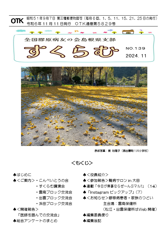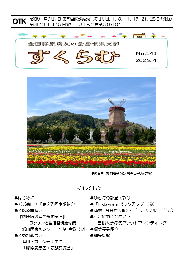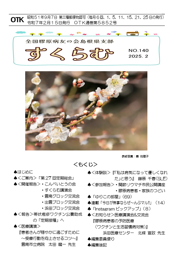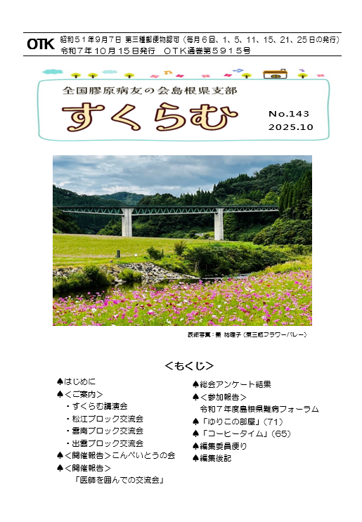 ♠はじめに ♠<ご案内> ・すくらむ講演会 ・松江ブロック交流会 ・雲南ブロック交流会 ・出雲ブロック交流会 ♠<開催報告>こんぺいとうの会 ♠<開催報告> 「医師を囲んでの交流会」 ♠総会アンケート結果 ♠<参加報告> 令和7年度島根県難病フォーラム ♠「ゆりこの部屋」(71) ♠「コーヒータイム」(65) ♠編集委員便り ♠編集後記